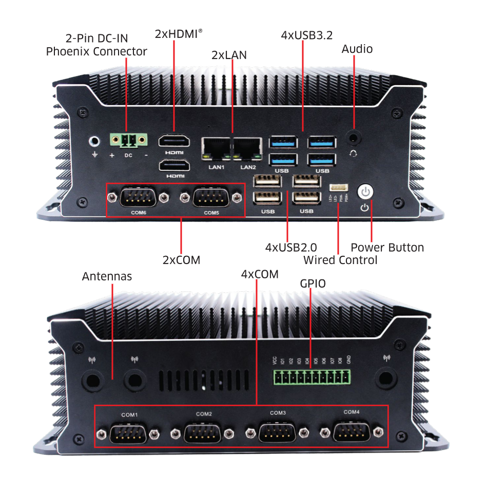 坚固耐用的设计:IXH-AL35 MiniPC采用铝制外壳和无风扇结构,具备出色的散热性能和防尘功能,能够在恶劣的工业环境中稳定运行,确保设备的长寿命和可靠性。