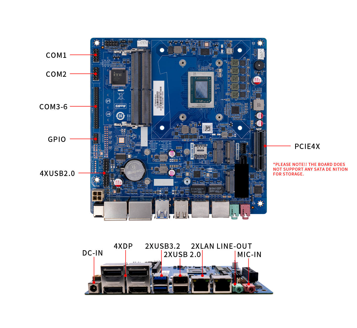 丰富工业级接口:配备6个COM串口、8个USB接口、8位GPIO等专业接口,全面支持工业自动化设备连接需求,是工业控制、智能制造的理想选择。
